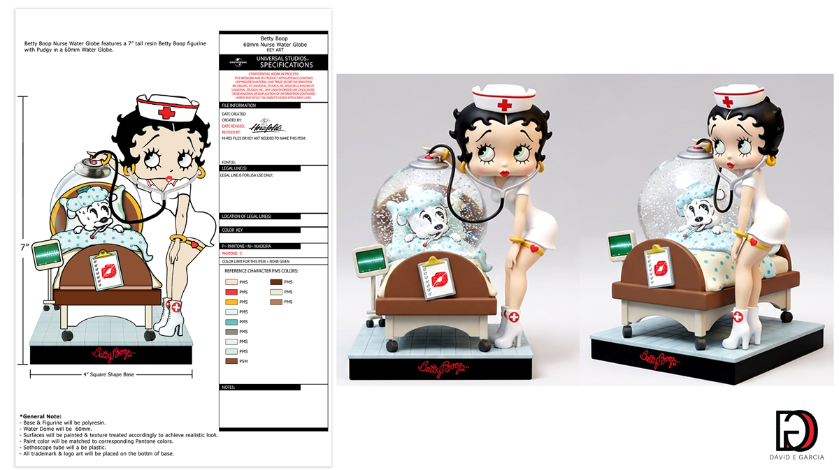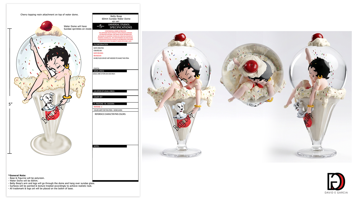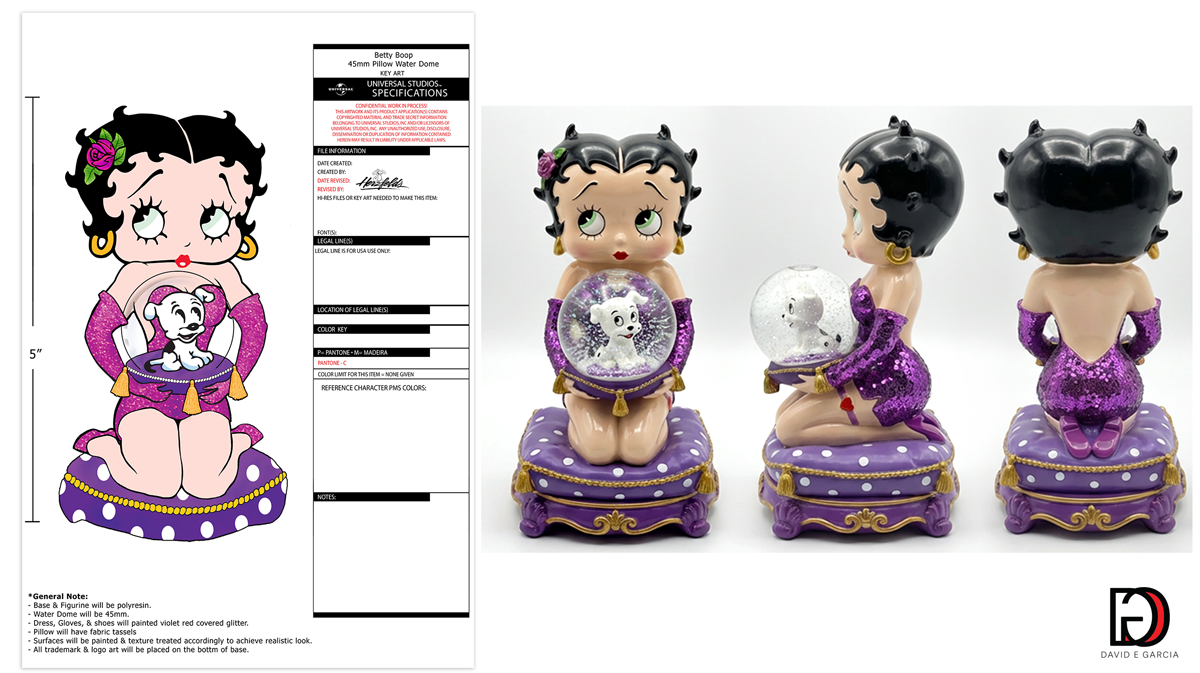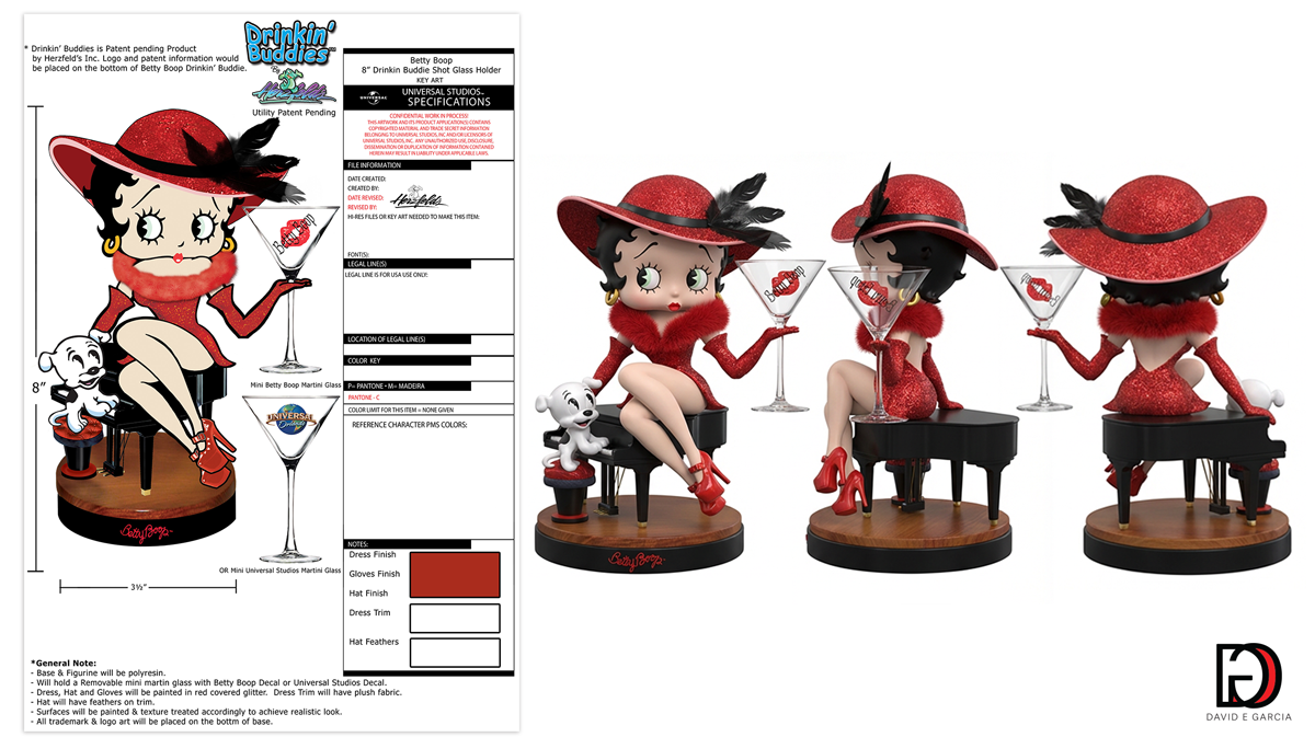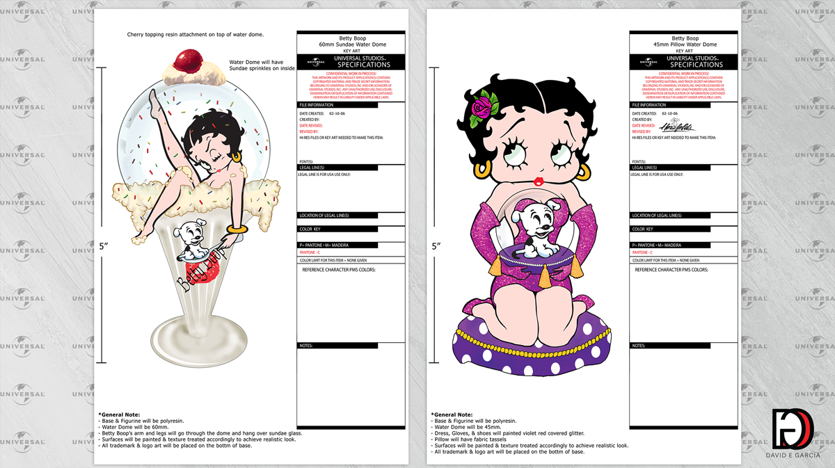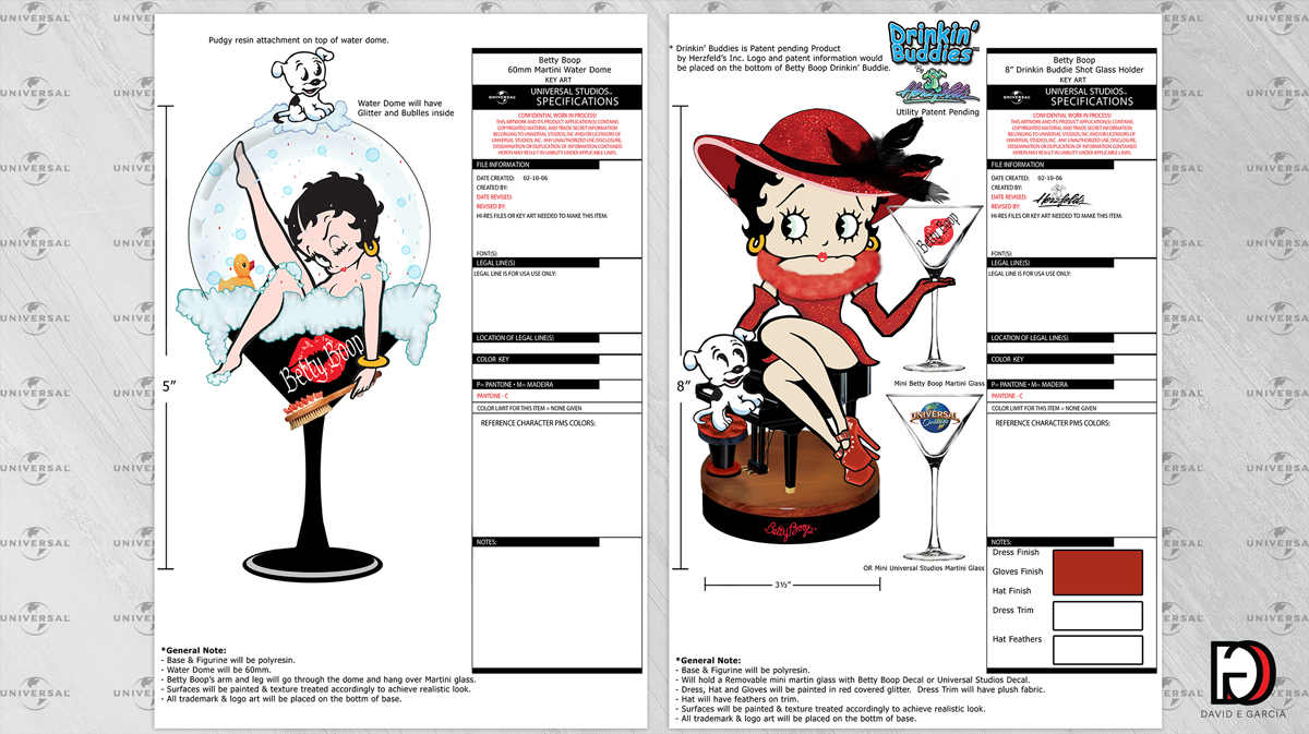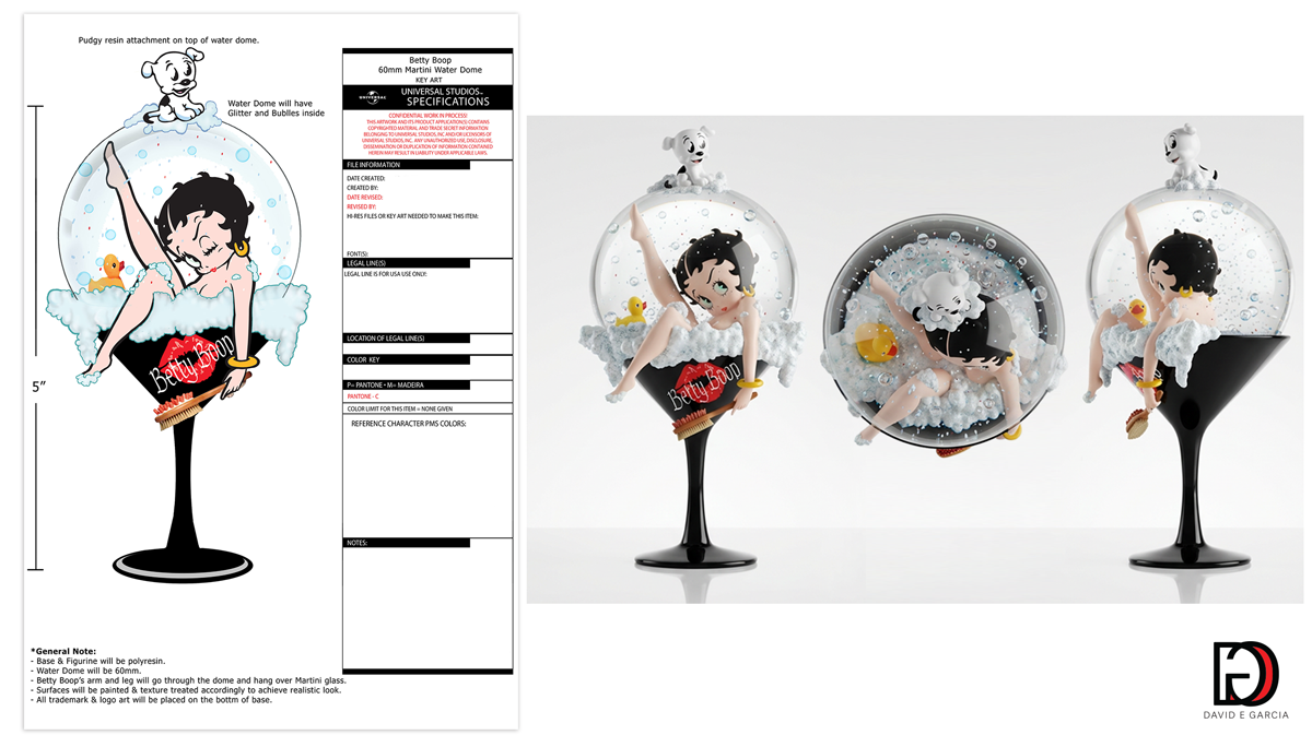 Showcased above are two unique poly resin collectible figurine concepts. The first is a whimsical Betty Boop "Martini" 60 mm snow globe concept, showcasing her signature charm and playful spirit. The second is an elegant 8" "Cabaret" figurine perched on a piano, complete with a functional miniature Martini glass featuring a branded logo — a perfect blend of artistry and collectible appeal.
