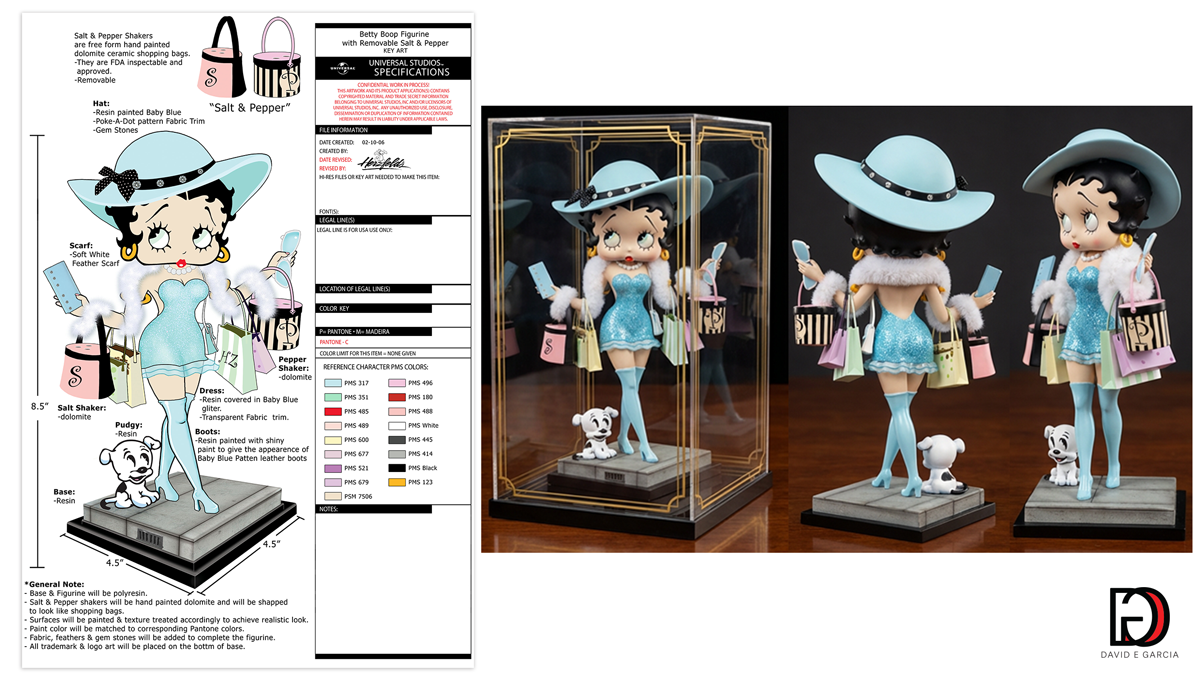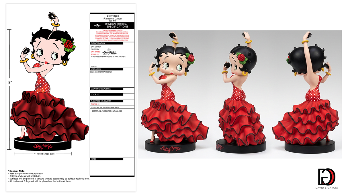 Featured above are two charming poly resin collectible figurine concepts. The first is a delightful Betty Boop "Retail Therapy" piece, complete with a functional salt and pepper shaker set — a perfect blend of fun and functionality. The second is an elegant 8" Flamenco Dancer figurine, beautifully crafted to capture the grace and passion of traditional Spanish dance.
