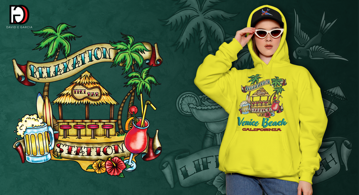 A tiki bar-inspired illustration emphasizing chill and indulgence, personalized with “Venice Beach” to celebrate the local beach culture.